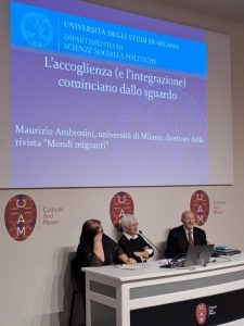 Il professor Maurizio Ambrosini dell’Università di Milano e la mediatrice culturale Maryam Elgendi, moderati da Marta Margotti (Prima presidente di Mondi in Città), hanno intrattenuto gli astanti sulle sfide dell’accoglienza e dell’integrazione dei migranti e sull’importanza dell’apprendimento dell’italiano.
